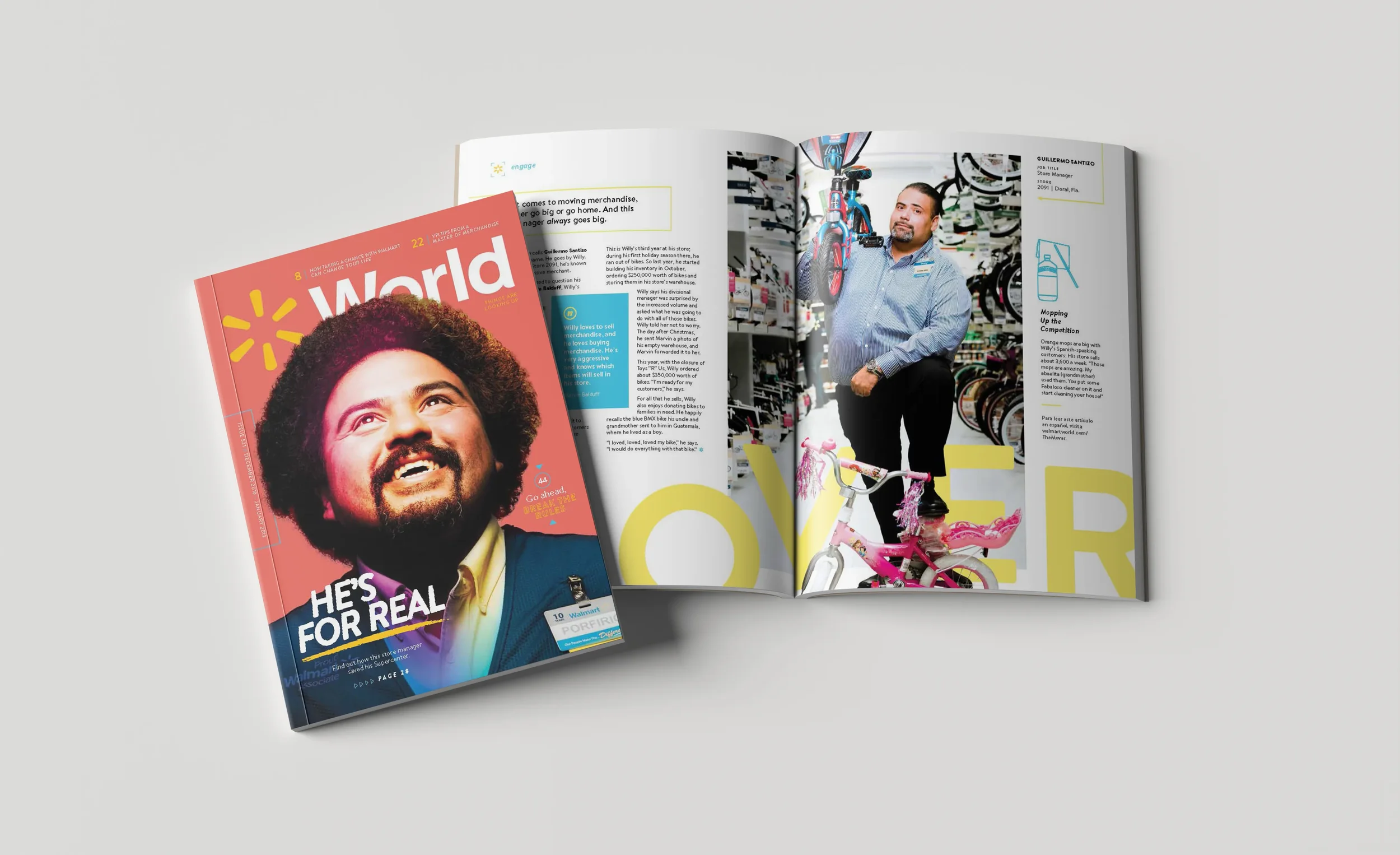 Walmart clients wanted to champion in a new era for Walmart World (an associate facing publication) by re-imagining the look and content to focus on celebrating hard working associates. Each quarterly issue contained stories and spreads that were unique to each issue, resulting in no two issues looking alike.